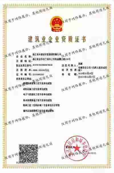 浙江清水建設(shè)安裝集團(tuán)有限公司成立于2013年,注冊資金6688萬元。集團(tuán)具有消防設(shè)施工程專業(yè)承包壹級、城市與道路照明專業(yè)承包壹級、電子與智能化專業(yè)承包壹級、建筑裝飾裝修專業(yè)承包貳級、防水防腐保溫專業(yè)承包貳級、市政工程施工總承包貳級、機(jī)電工程施工總承包貳級、建筑工程施工總承包貳級、電力工程施工總承包貳級、機(jī)電工程專業(yè)承包貳級、環(huán)保工程專業(yè)承包貳級、古建筑工程專業(yè)承包貳級、特種工程結(jié)構(gòu)補(bǔ)強(qiáng)專業(yè)承包、建筑施工勞務(wù)作業(yè)專業(yè)承包(憑建筑業(yè)企業(yè)資質(zhì)證書經(jīng)營